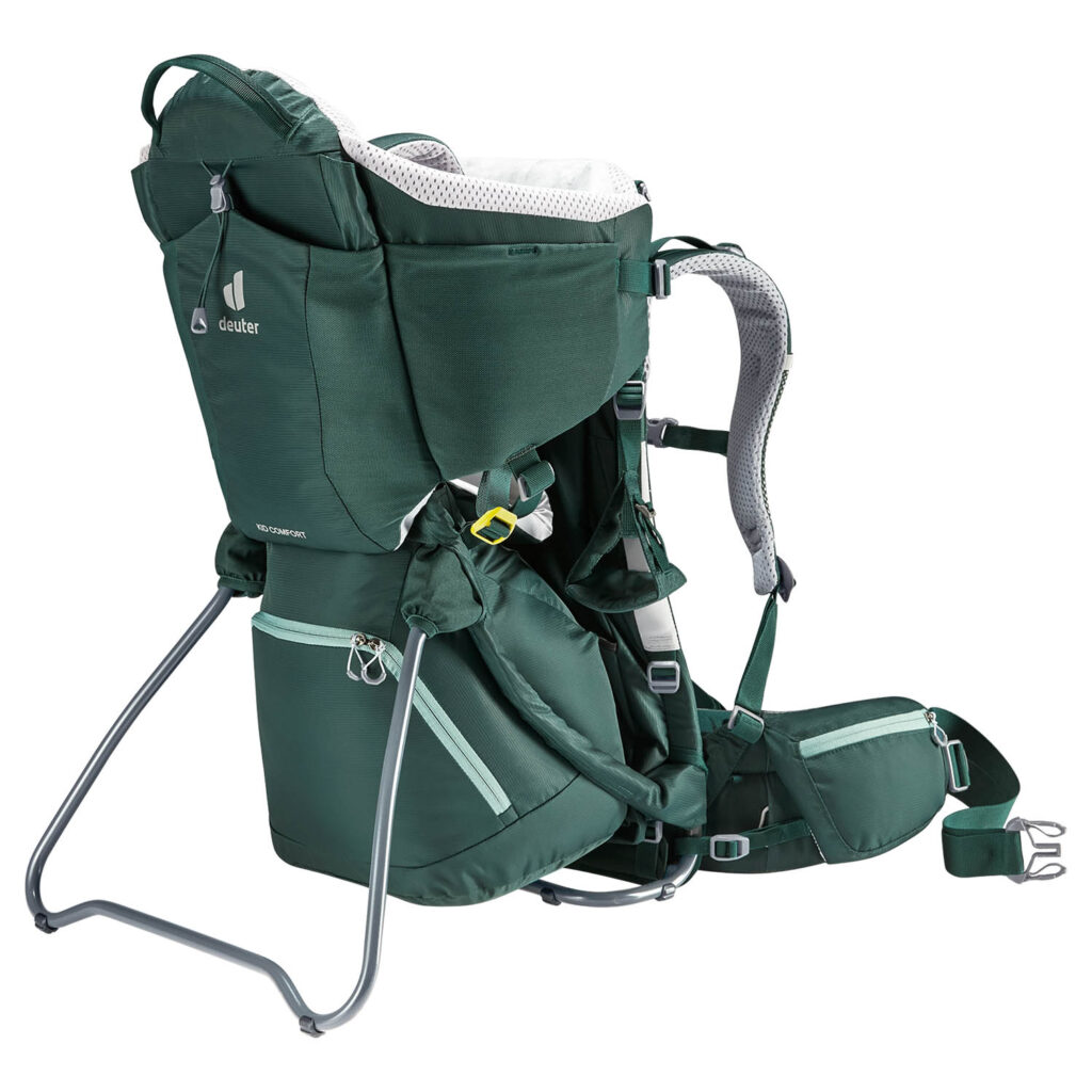 ドイター キッドコンフォートシリーズの最大の特徴は背面の通気性と調整幅の広さです。フレームと背面パネルの間に空間を持たせる構造により、登山中でも背中が蒸れにくくなっています。背面長の調整幅が広いため、家族で使い回しやすい点も実用性の高いポイントです。
