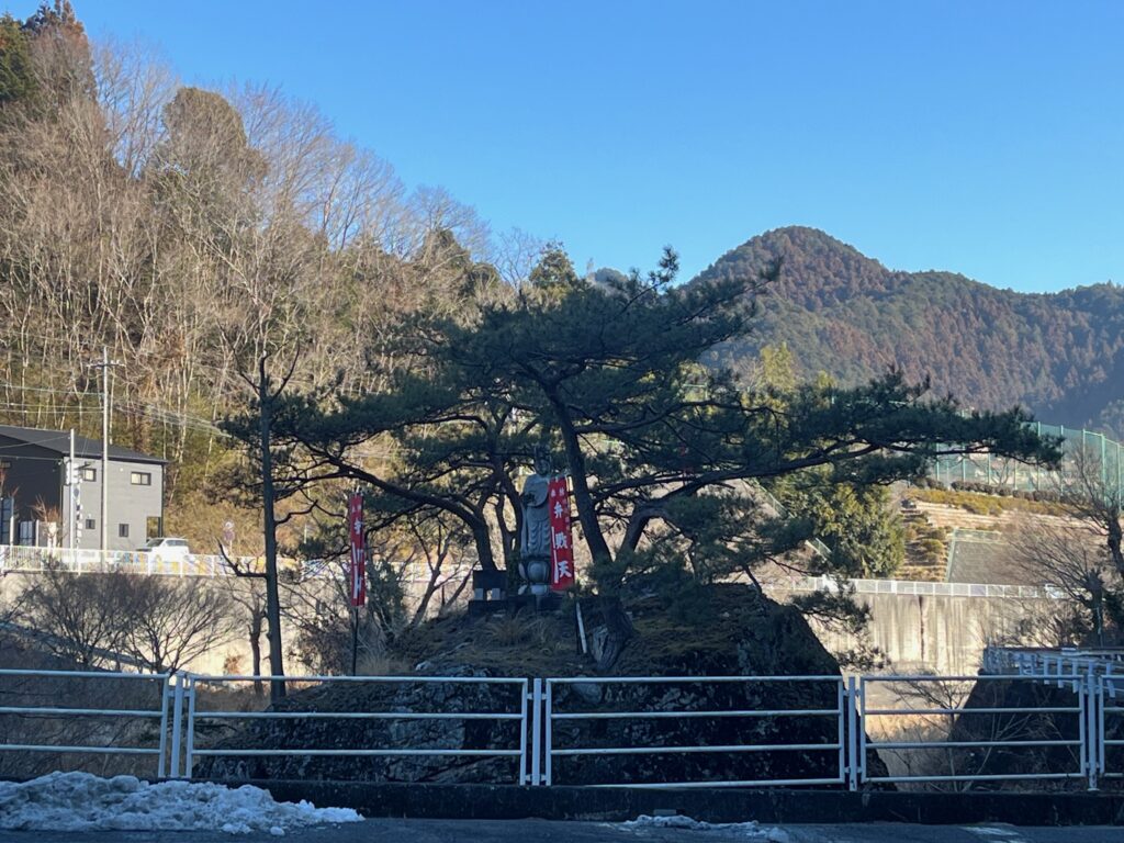 駐車場から登山口まではしばらく道路を歩きます、途中に弁財天を眺め