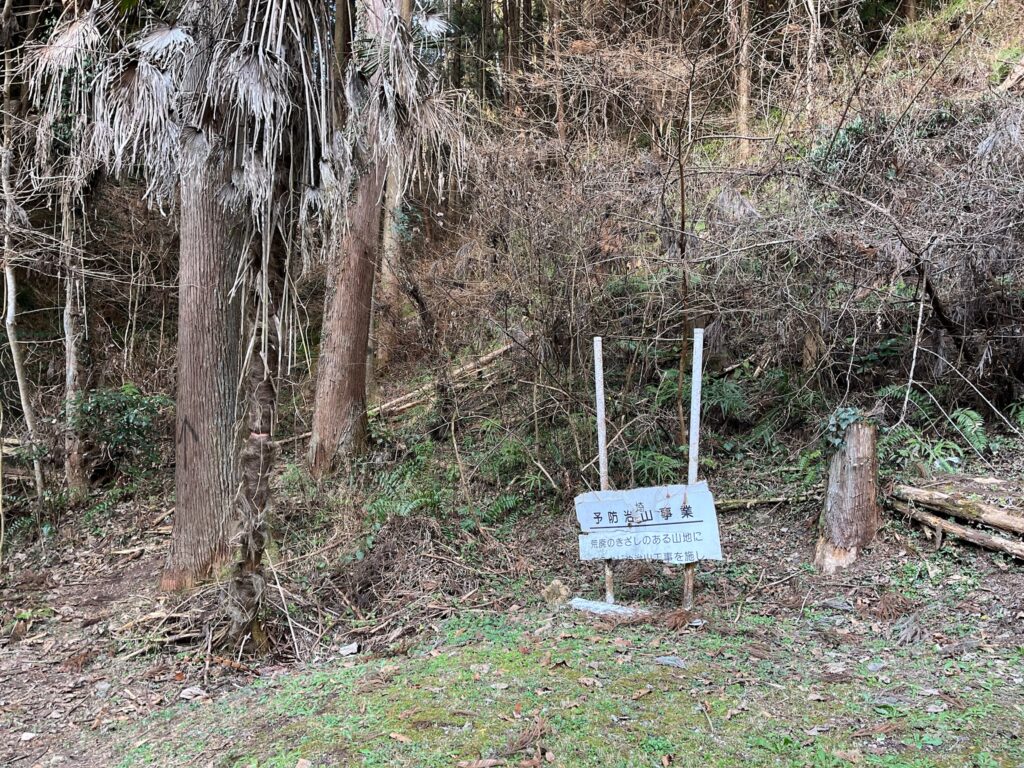 こちらの分岐から天久保山(向本陣山)に入れるようです。荒廃のきざしのある山地に‥の看板が荒廃しています‥